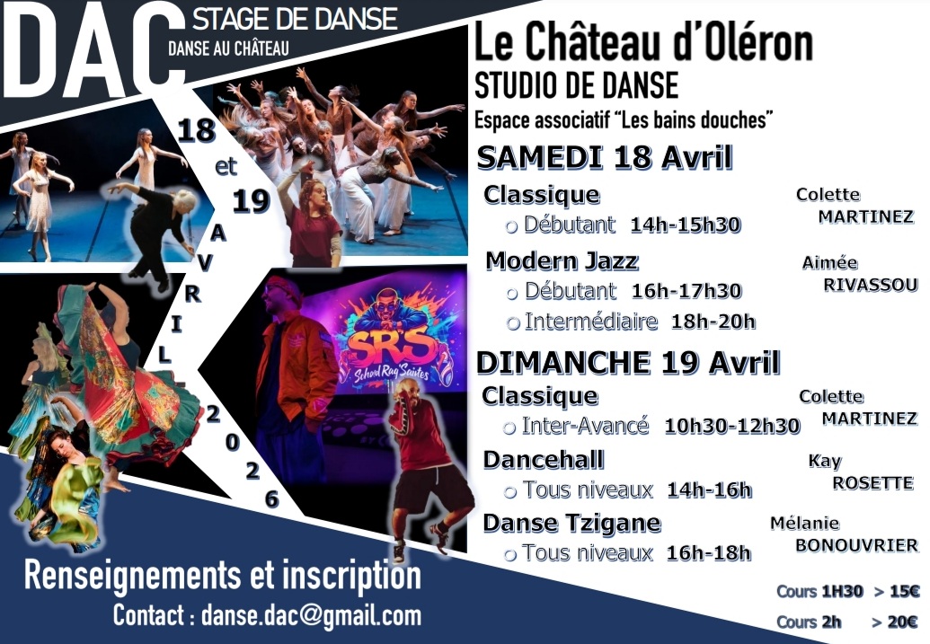 RDV les 18 et 19 avril au Château d’Oléron avec des intervenants de qualité qui aiment à partager leur passion de la danse.