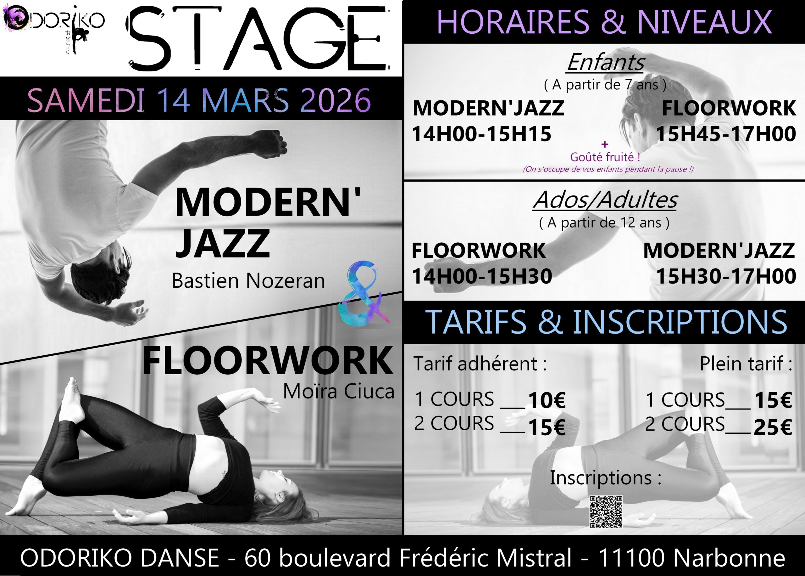 Venez découvrir Bastien Nozeran en Modern’Jazz et Moïra Ciuca en Floorwork le samedi 14 mars 2026 chez Odoriko Danse à Narbonne !