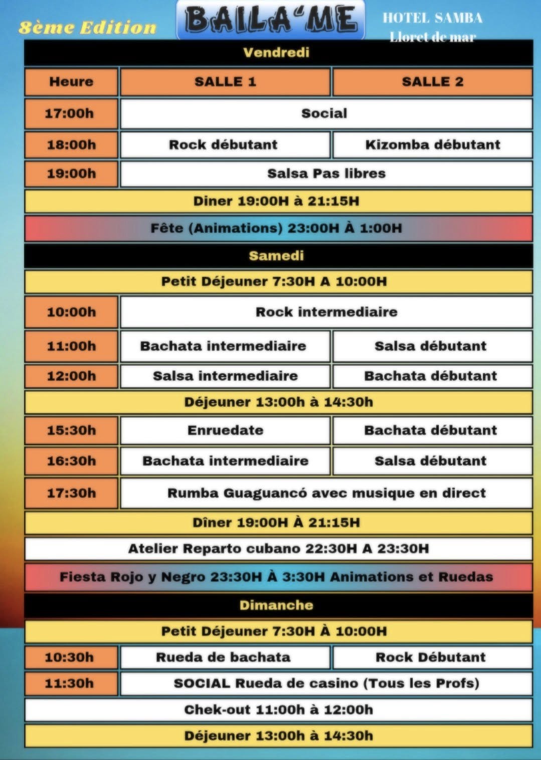 Nous vous présentons BAILA’ME au SAMBA HOTEL à Lloret de mar. Les 10, 11 et 12 OCTOBRE 2025. Cours de Salsa, Bachata, Rueda de casino, Rock, Kizomba et bien plus encore…